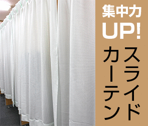 自習室クオレでは、ご利用者様に勉強の事だけを考えて頂きたいので、気が散らずに集中して長時間快適に勉強して頂けるように室内設備を色々と工夫させて頂いております。1席ごとに隣のデスクと背の高いパーテーションで完全に区切り、着座状態で横を向いても隣の席のご利用者様が視界に入らないようにしております。また、お席の後方視界が気になる方の為にカーテン付きの個室風のお席もご用意させて頂いております。