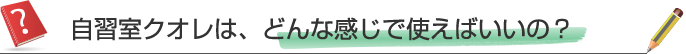 ご自身のライフスタイルに合わせてご利用ください。 講義と講義の空き時間を効率的にクオレで自習して頂くのも良いと思いますし、重い教科書の持ち運びが大変なようでしたら、朝、クオレに寄って、教科書を持って予備校に行って勉強し、帰りにクオレによって復習をして教科書をロッカーに置いて帰る。こんな使い方でもよろしいかと思います。また社会人の方でしたら出勤前に1時間勉強して、仕事帰りに2時間勉強する。これもよろしいかと思います。鍵付きロッカーもご用意しているので、手ぶらで来て手ぶらで帰る事が可能でございます。